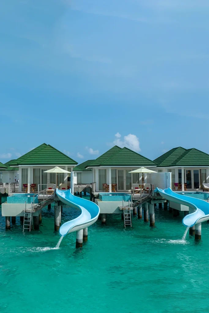 These fun and special Water Villas feature your own private pool and comes with a fun slide. Perfect for those who love a little fun on their holidays to make unforgettable memories. Enjoy your private sundeck with sun loungers, a bathroom with indoor shower, a mini bar, Wi-Fi and views that are out of this world.
